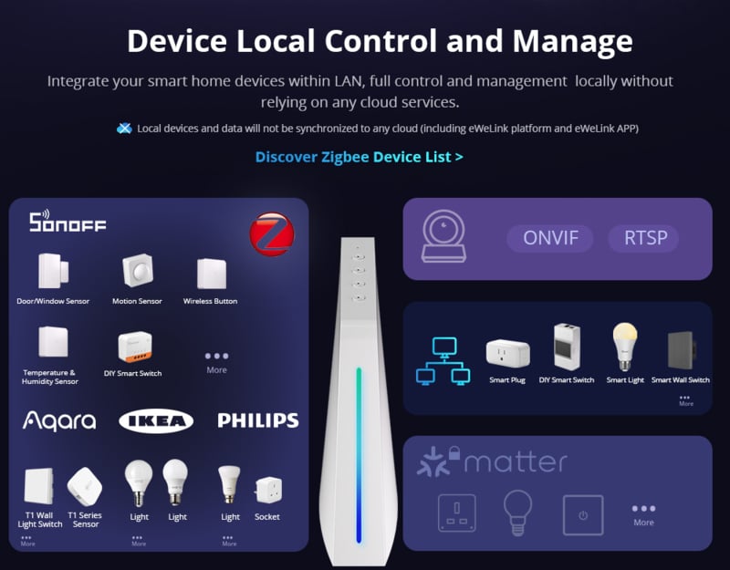 Il prend en charge la connexion et le contrôle des périphériques LAN. Exécutez l’appareil même si Internet est en panne et gérez jusqu’à 128 sous-appareils, travaillez avec des routeurs Zigbee pour étendre la portée du réseau Zigbee et réaliser le contrôle de toute la maison.