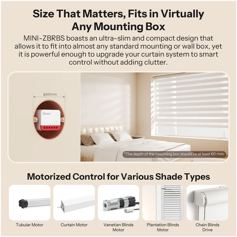 Le module volet roulant Zigbee SONOFF MINI-ZBRBS permet de transformer vos volets, rideaux ou stores en équipements connectés. Compact et facile à intégrer dans une boîte murale standard, il offre un contrôle précis de l’ouverture en pourcentage, agit comme répéteur Zigbee et supporte les interrupteurs manuels existants. Une solution idéale pour moderniser vos installations sans compromis.